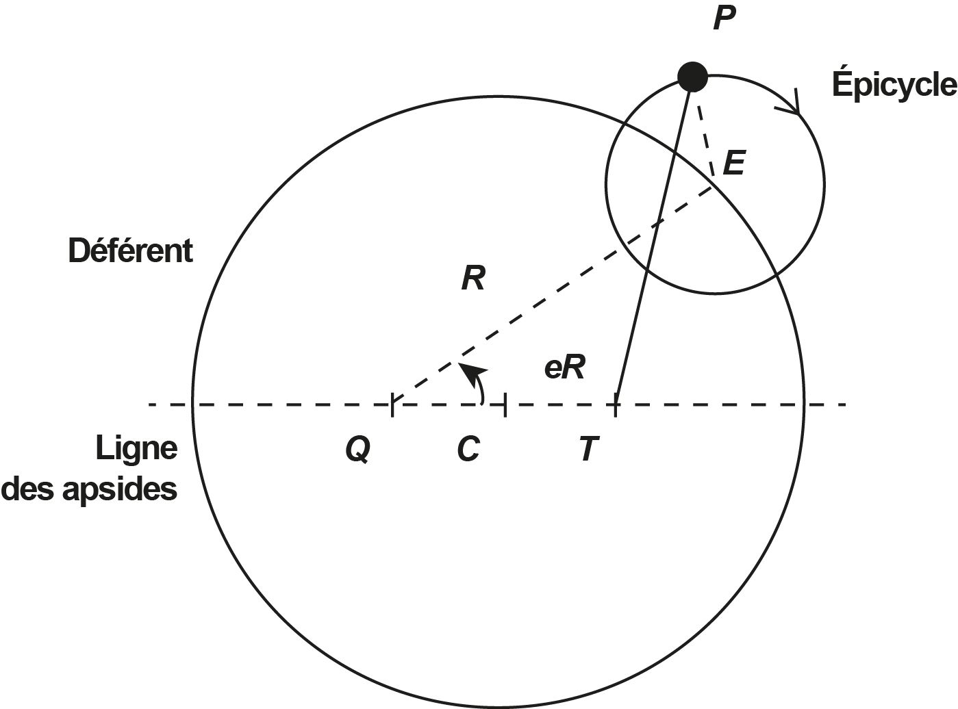 Sur la figure 2, la planète P décrit le cercle de centre C et de rayon R. Son mouvement est défini par la rotation uniforme QP autour du point équant Q, d’angle