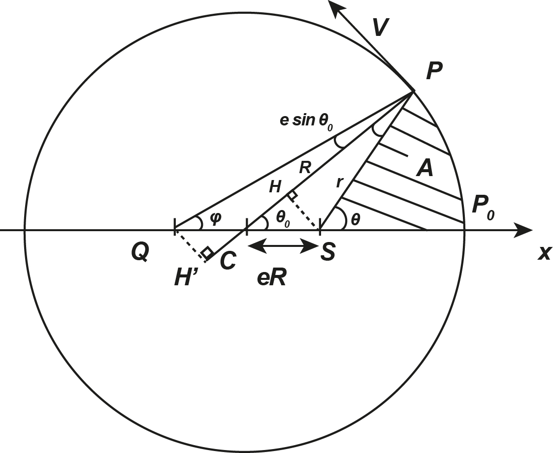 Lecture : unknown notation croît uniformément avec le temps. La planète est en P. Le soleil en S occupe une position excentrée ; Q est symétrique de S par rapport au centre C.
