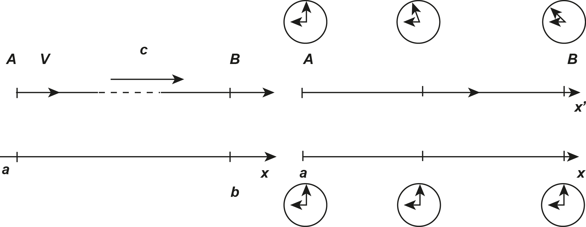 Je suppose que des observateurs placés en différents points, règlent leurs montres à l’aide de signaux lumineux ; qu’ils cherchent à corriger ces signaux du temps de la transmission, mais qu’ignorant le mouvement de translation dont ils sont animés et croyant par conséquent que les signaux se transmettent également vite dans les deux sens, ils se bornent à croiser les observations, en envoyant un signal de A en B, puis un autre de B en A. Le temps local t’ est le temps marqué par les montres ainsi réglées.