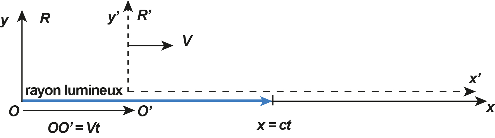qui décrit l’entraînement à la vitesse V du système physique dans un référentiel immobile (l’éther). En mécanique newtonienne, le temps est « absolu » et l’égalité implicite