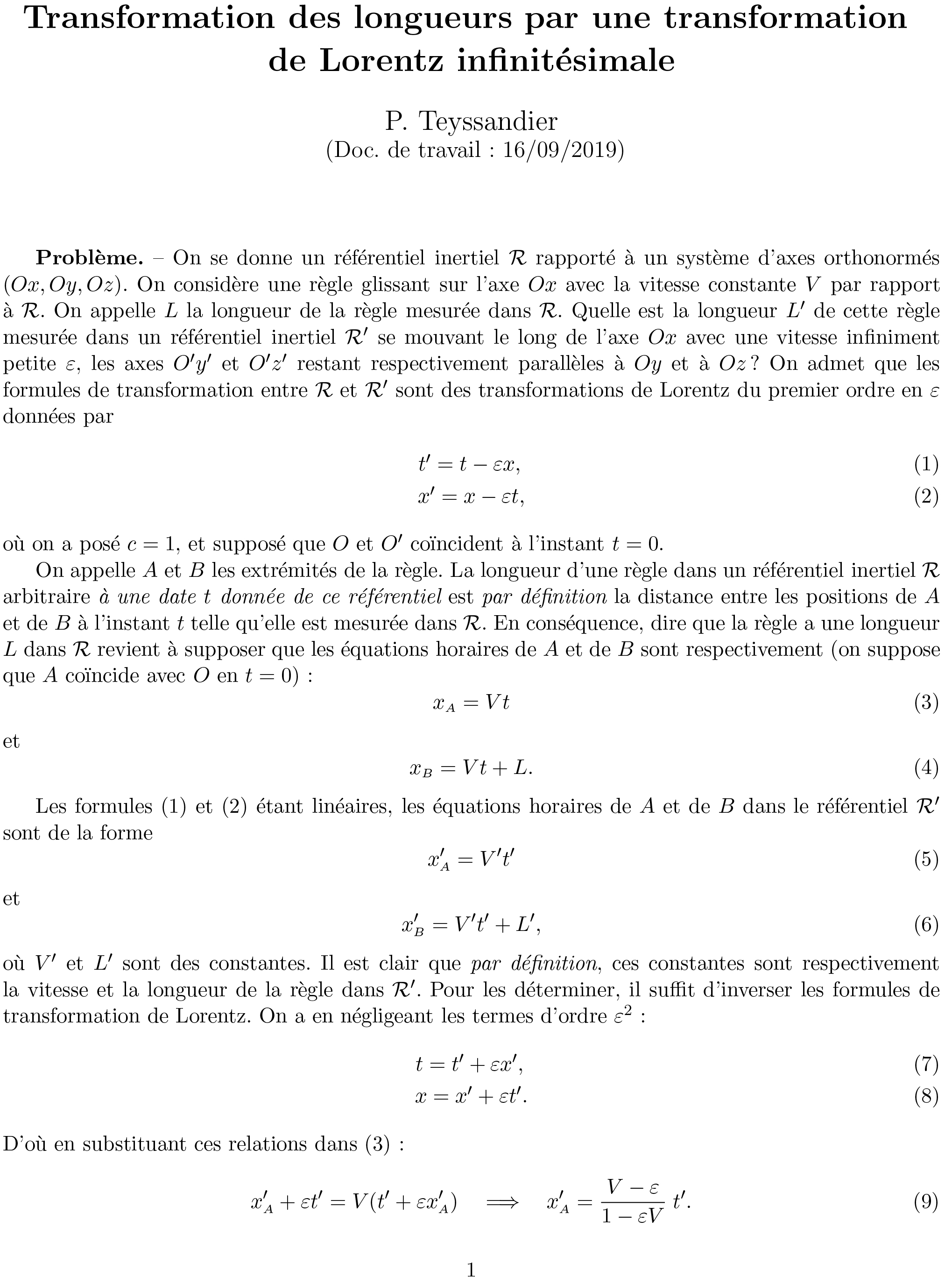 où l’ est sa longueur dans R’ (Provost & Bracco, 2016). En exprimant x et t en fonction de x’ et t’ avec les relations (6) et (7), soit